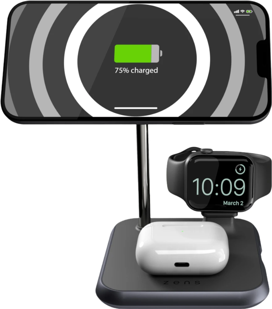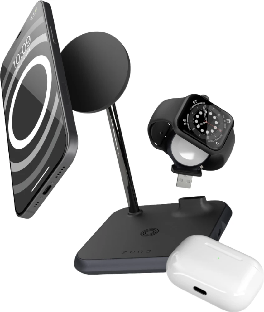 Das 4-in-1-Ladegerät verfügt über einen magnetischen kabellosen 7,5-W-Ausgang für iPhone 12 und höher, ein kabelloses 5-W-Ladegerät für AirPods, einen integrierten USB-A-Anschluss für den Apple Watch Stick und einen 18-W-USB-C-Ausgangsanschluss. Über den USB-C-Anschluss können Sie beispielsweise ein iPad aufladen. Das Ladegerät wird mit einem AC/DC-Adapter geliefert. Perfekt für den Schreibtisch, um sicherzustellen, dass keine Anrufe oder Benachrichtigungen verpasst werden.